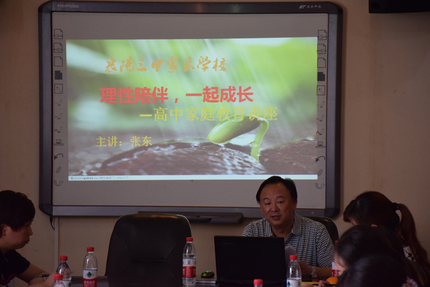 在學(xué)校會(huì)議室,家長(zhǎng)委員會(huì)代表齊聚一堂,由政教處主任張東主持開(kāi)展了家長(zhǎng)學(xué)校的培訓(xùn)交流活動(dòng)。分管德育的副校長(zhǎng)曹威作了重要講話(huà),熱烈歡迎家委會(huì)代表與會(huì),強(qiáng)調(diào)了加強(qiáng)學(xué)校與家庭溝通與配合,需要充分發(fā)揮家長(zhǎng)委員會(huì)的作用,歡迎家委會(huì)代表們對(duì)學(xué)校管理、教育教學(xué)、校風(fēng)學(xué)風(fēng)等方面建言獻(xiàn)策。張主任向家委會(huì)代表介紹了家長(zhǎng)學(xué)校的有關(guān)工作安排,并結(jié)合實(shí)際作了《理性陪伴,一起成長(zhǎng)》的高中生家庭教育講座,生動(dòng)幽默地交流了在家庭教育中的一些好的做法和經(jīng)驗(yàn),贏得了家委會(huì)代表的一陣陣掌聲。通過(guò)交流培訓(xùn),家長(zhǎng)們?cè)谌绾卫硇耘惆?、尊重和關(guān)愛(ài)孩子、培養(yǎng)孩子的好習(xí)慣等方面受益匪淺。