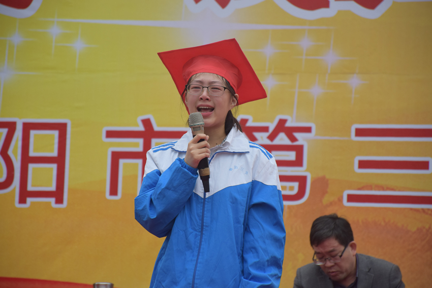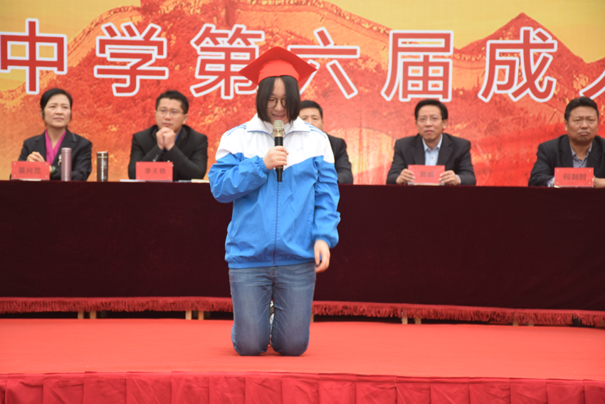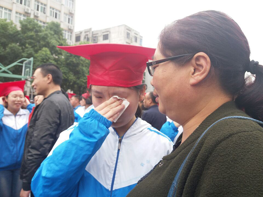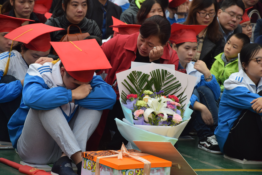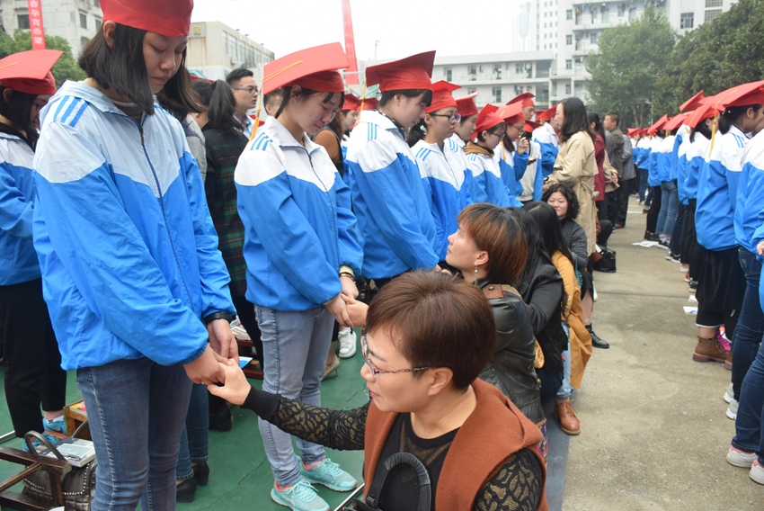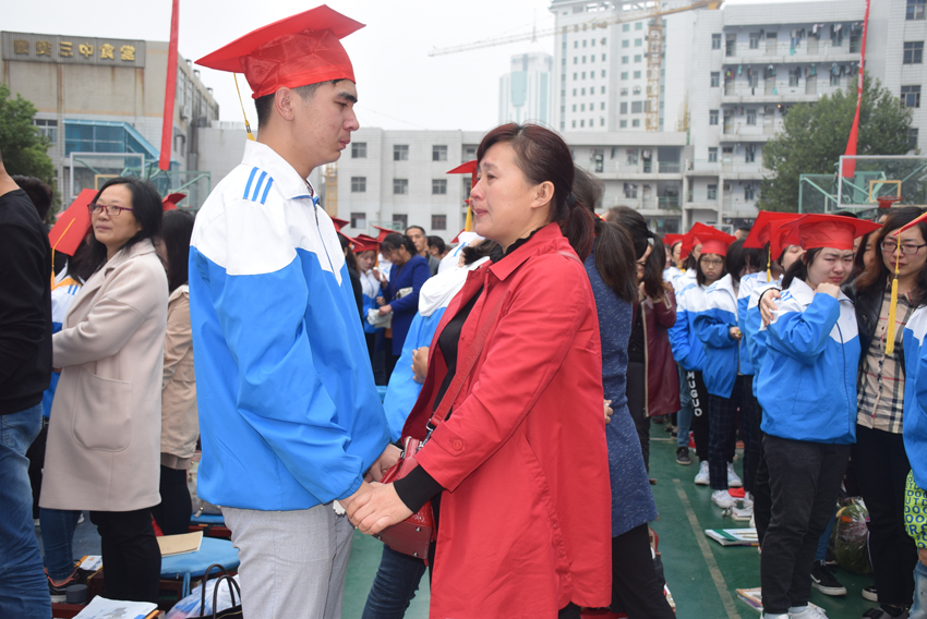 高三(20)班王子琪同學的現(xiàn)場發(fā)言——《感恩的心》將儀式推向了高潮。她選取了日常生活中父母呵護孩子的典型事例,有常年如一日給孩子送飯的,有父母生病瞞著孩子的,有高考一直守在考場外的,個個感人至深。講著講著,家長們已是熱淚盈眶,學生更是淚流滿面。1