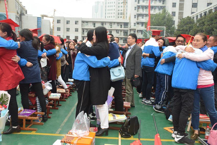 王子琪同學現(xiàn)場發(fā)問:“我們記得父母的生日是哪一天?在我們放月假享受父母伺候時,有沒有想過父母辛苦勞累了多長時間沒有休息了?當我們犯錯誤或成績下降時,有沒有想過父母的心里是怎樣的酸楚呢?”學生們都一個個羞愧地低下了頭。她提議全體同學面向父母,摸摸父母粗糙的手,看看他們眼角的皺紋,又多了幾道?數(shù)數(shù)他們頭上的白發(fā),又增添了幾根……學生和父母相擁而泣,有的孩子已是嚎啕大哭。