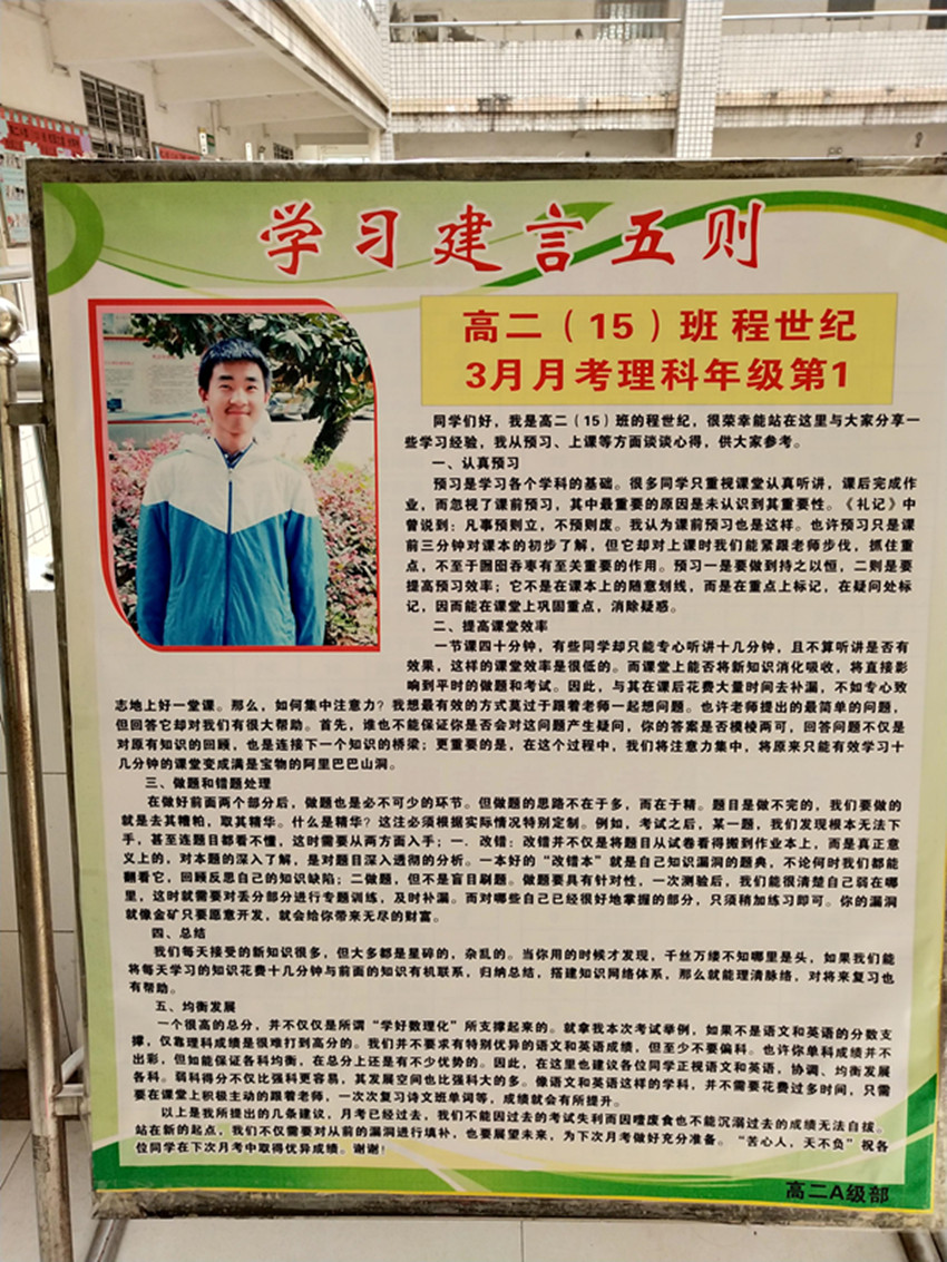 一個很高的總分,并不僅僅是所謂“學好數(shù)理化”所支撐起來的。就拿我本次考試舉例,如果不是語文和英語的分數(shù)支僅靠理科成績是很難打到高分的。我們井不要求有特別優(yōu)異的語文和英語但至少不要偏科。也許你單科成績并出彩,但如能保證各科均衡,在總分上還是有不少優(yōu)勢的。因此,在這里也建議各位同學正視語文和英語,協(xié)調(diào)、均衡發(fā)展各科。弱科得分不僅比強科更容易,其發(fā)展空間也比強科大的多。像語文和英語這樣的學科,并不需要花費過多時間,只需要在課堂上積極主動的跟著老師,一次次復習詩文班單詞等,成績就會有所提升。