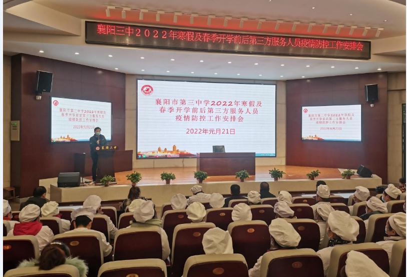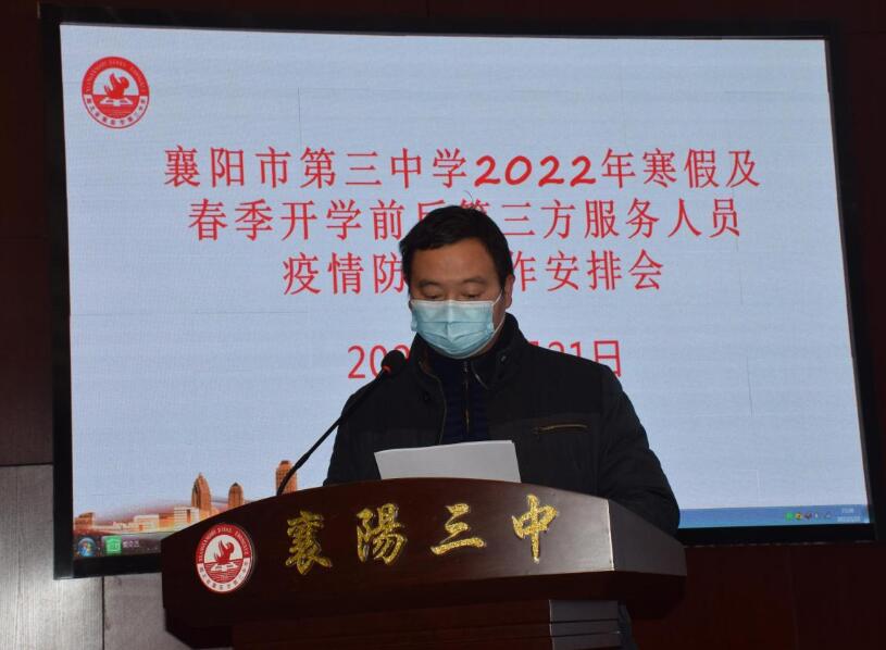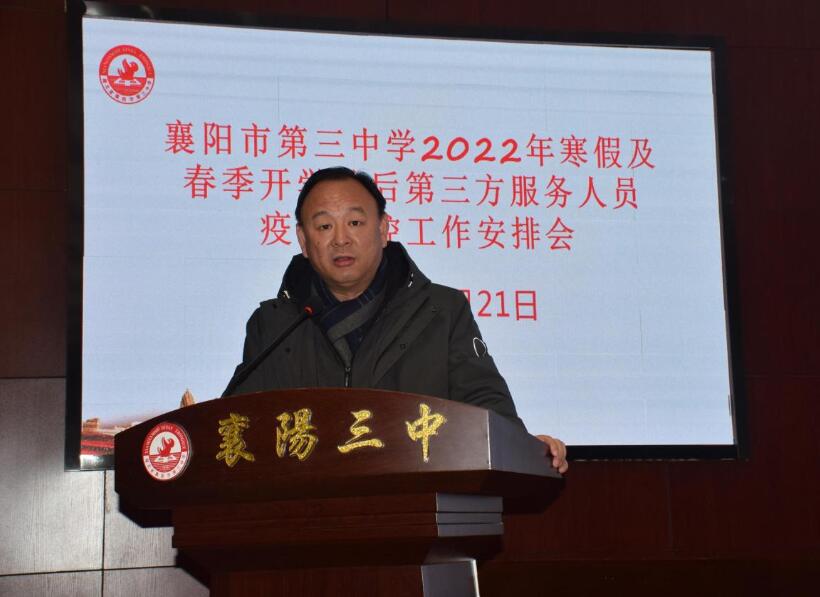 2022年1月21日下午,襄陽(yáng)三中召集學(xué)校第三方服務(wù)公司全體員工在聞道廳召開2022年寒假及春季開學(xué)前后疫情防控工作安排會(huì),副校長(zhǎng)張東出席會(huì)議并講話。會(huì)議由總務(wù)處楊勝安主任主持。