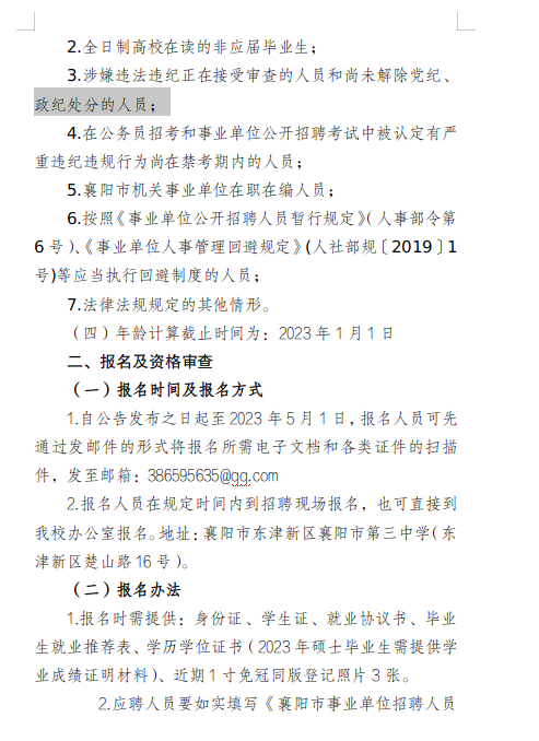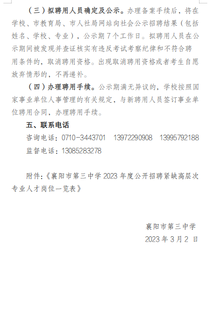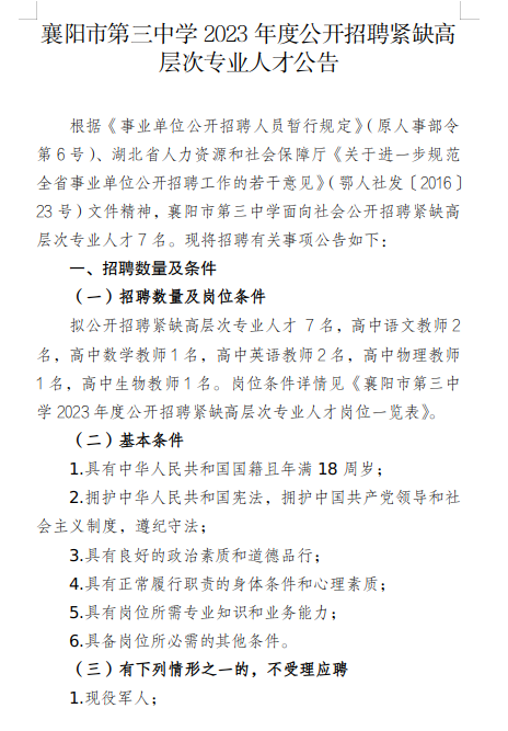 襄陽市第三中學2023年度公開招聘緊缺高層次專業(yè)人才公告