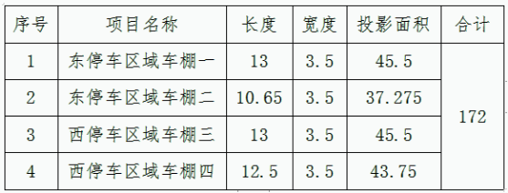 1、采購內(nèi)容:對校園內(nèi)東西兩個區(qū)域建設(shè)四個電動自行車充電所用的停車棚,并負(fù)責(zé)安裝到位。